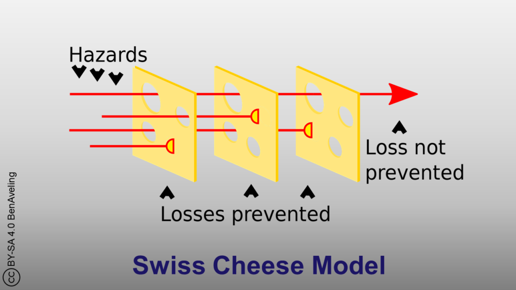 I mentioned the Swiss cheese model, developed by James T. Reason, during the live Q&A and will expand a little on it here.